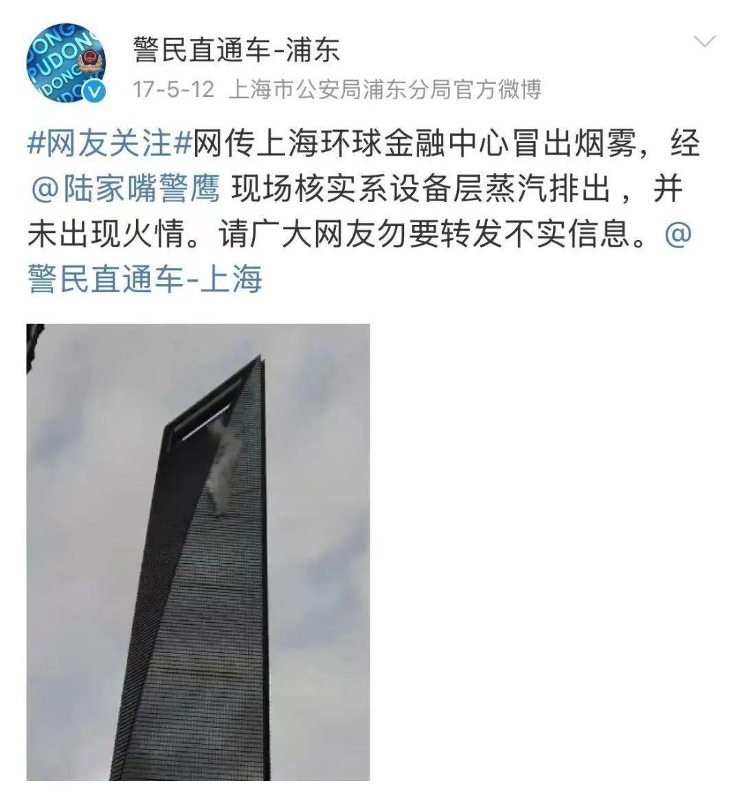 △1月21日,大楼外部并无异常早在2017年,这一现象就曾经发生过,当时浦东警方就辟谣称,这只是设备层蒸汽排出,并非发生了火情。